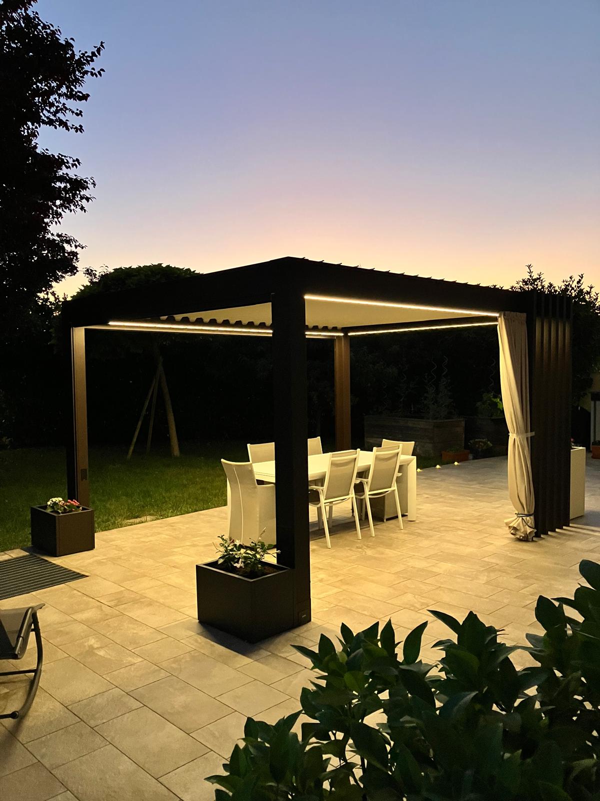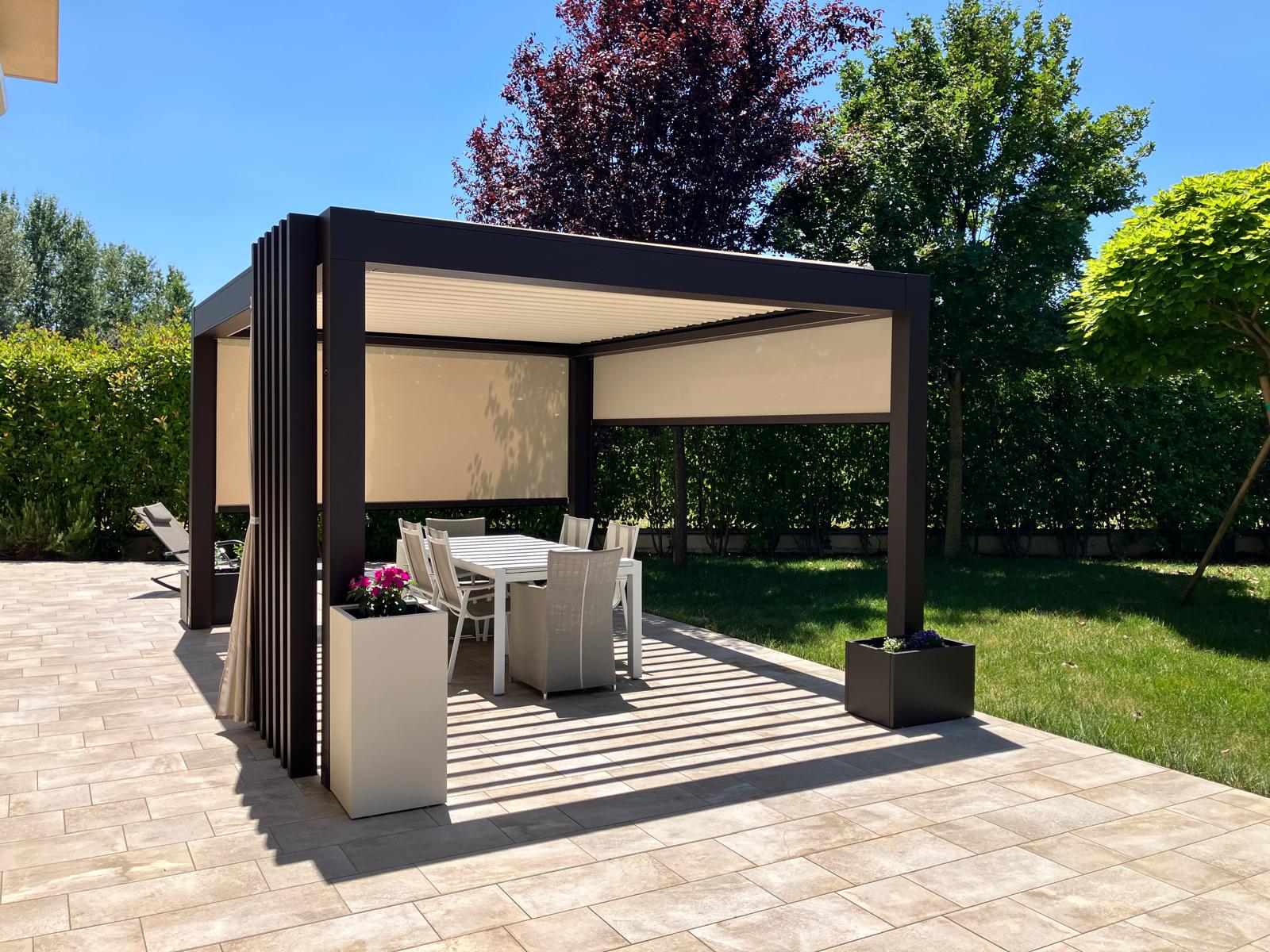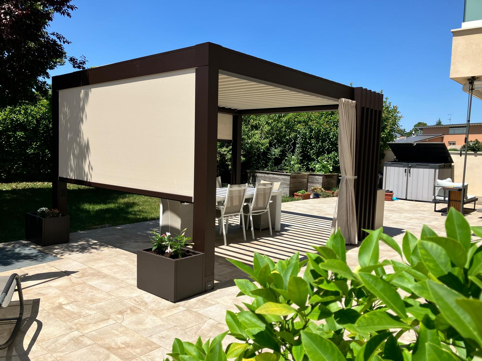 Le nuove pergole bioclimatiche sono costituite da una serie di lamelle orientabili che hanno la funzione di proteggere dalle intemperie, ombreggiare ed arieggiare la zona sottostante, creando così il massimo comfort in ogni stagione.